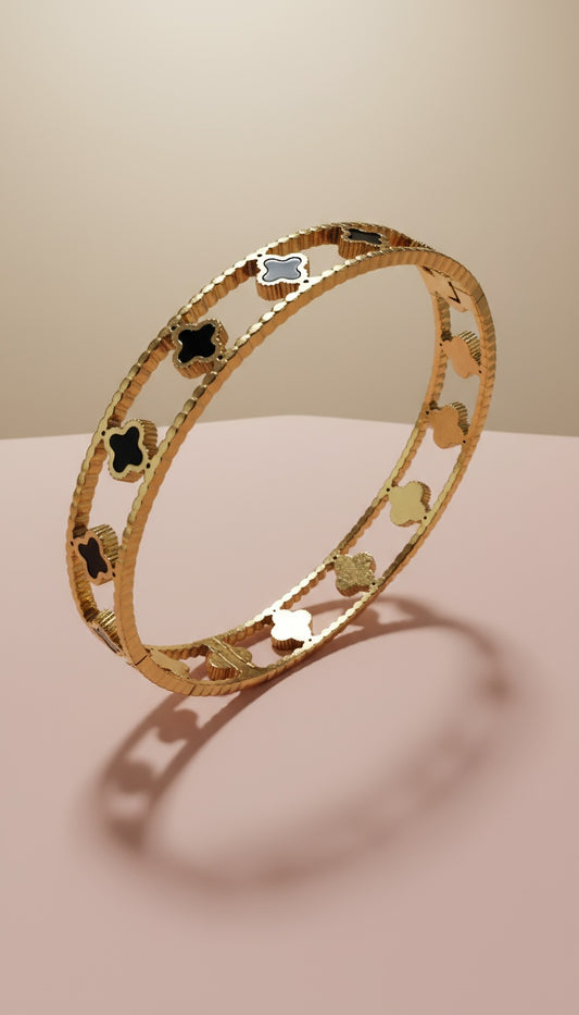 A symbol of luck and timeless grace — the Black n White Four-Leaf Clover Bangle blends polished stainless steel with gold plating for a refined statement. Its dual-tone inlay design adds sophistication, making it a versatile piece for both day and night looks. Styling Tip:Pair it with a minimalist watch...