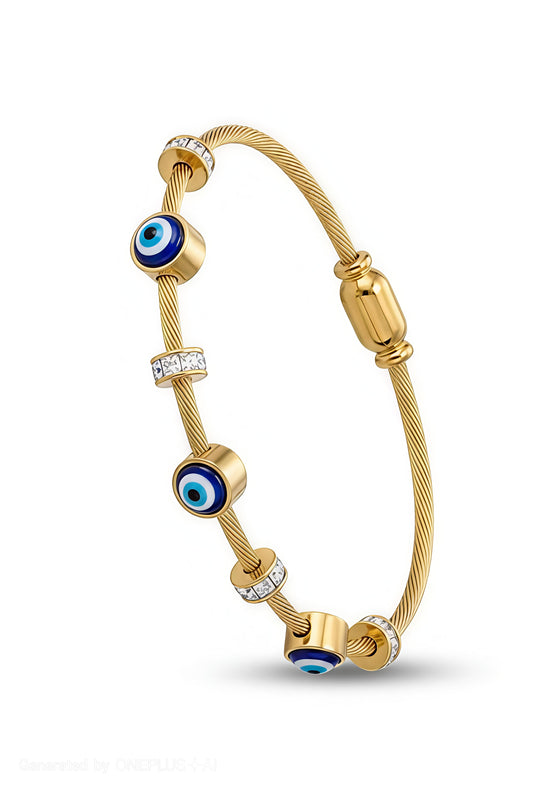 An iconic talisman reimagined in stainless steel and gold plating, the Classic Evil Eye Bangle symbolizes protection and positive energy. Its sleek form and captivating detail make it both meaningful and stylish. Styling Tip:Stack with simple gold bangles or wear solo to let the evil eye charm stand out. Cleaning...