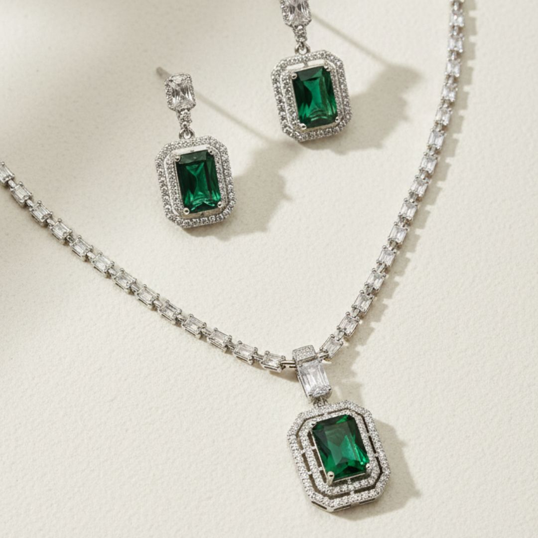 Silver Plated Rectangle Pendant AD Necklace Set for Women | Valentine’s Special Jewelry