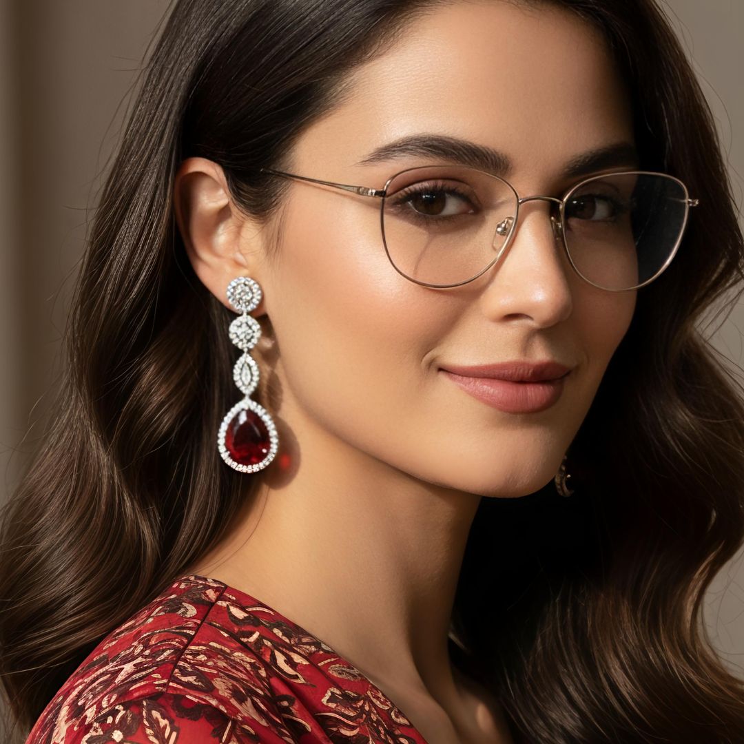 Scarlet Grace earrings feature brilliant AD stones with a striking red centerpiece that delivers timeless glamour. Their elegant dangling silhouette makes them perfect for weddings, festive celebrations, evening parties, and premium gifting.