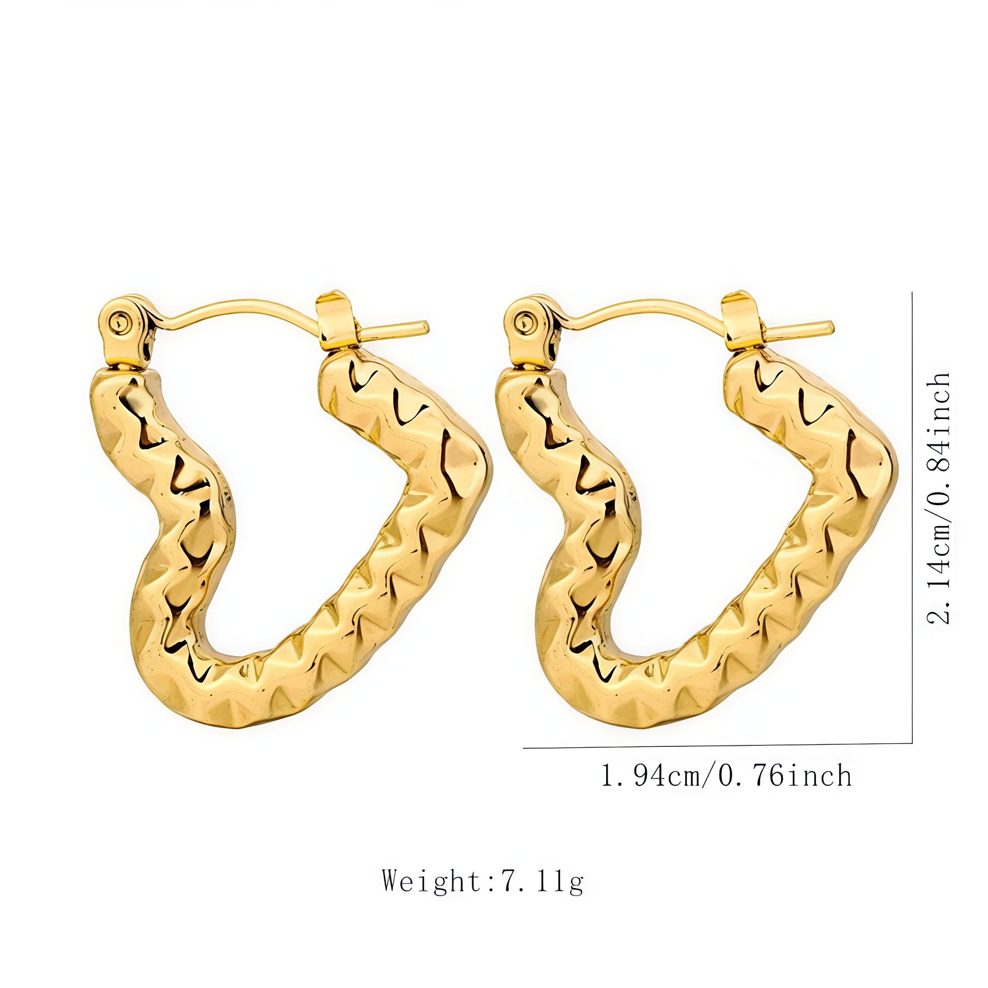 These heart-shaped hoops combine the strength of stainless steel with luxurious gold pleating for a chic everyday accessory. Lightweight and trendy, they add a touch of romantic charm to both casual and dressy outfits.