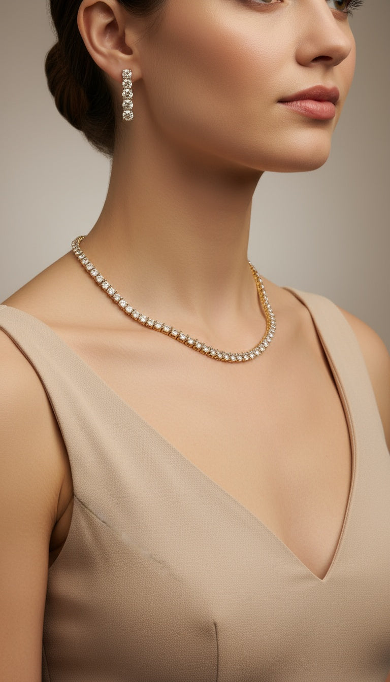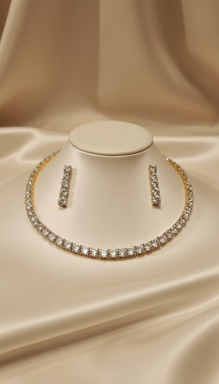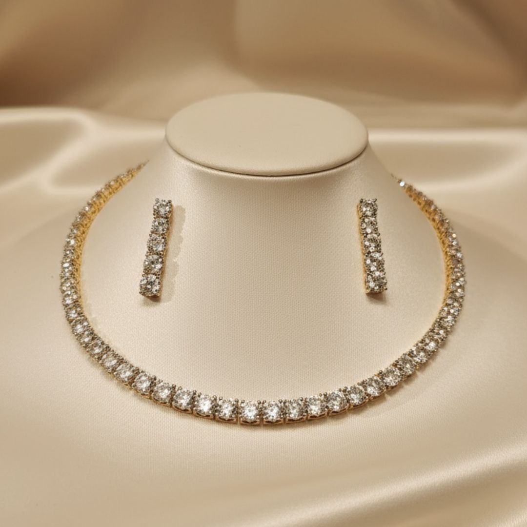 Elevate your elegance with The Golden Show Stopper Necklace Set, delicately gold-polished over premium metal brass. This captivating design radiates luxurious charm, making it the perfect statement for special evenings or festive celebrations. Its long-lasting shine mirrors your inner glow — bold, brilliant, and beautifully you. Styling Tip: Pair it with an off-shoulder gown or a saree for that show-stopping moment. Let the necklace take center stage — minimal earrings, bold confidence. Cleaning Tip: After each use, gently wipe with a soft, dry cloth and store in a fabric-lined jewelry box to preserve the polish and prevent tarnish.